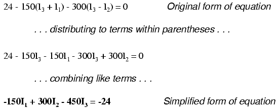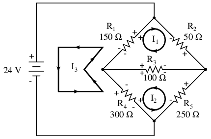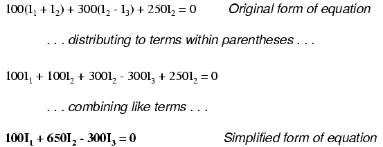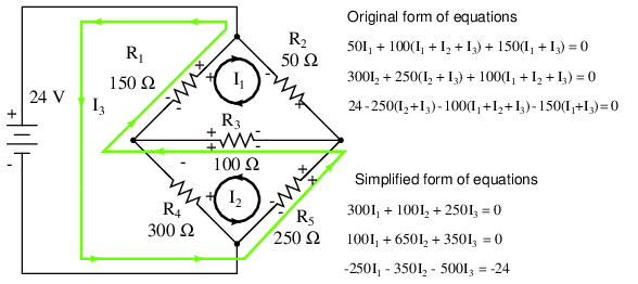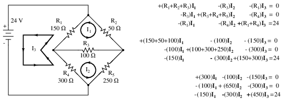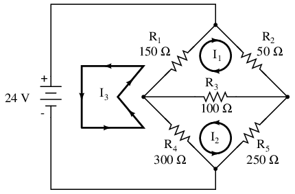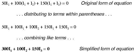 In this equation, we represent the common directions of currents by their sums through common resistors. For example, resistor R3, with a value of 100 Ω, has its voltage drop represented in the above KVL equation by the expression 100(I1 + I2), since both currents I1 and I2 go through R3 from right to left. The same may be said for resistor R1, with its voltage drop expression shown as 150(I1 + I3), since both I1 and I3 go from bottom to top through that resistor, and thus work together to generate its voltage drop.