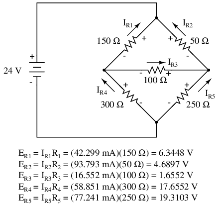 Now that we know the magnitude of all currents in this circuit, we can calculate voltage drops across all resistors with Ohm's Law (E=IR):