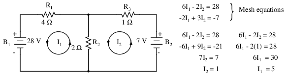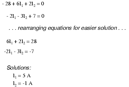 Now, with two equations, we can use one of several methods to mathematically solve for the unknown currents I1 and I2: