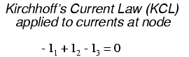 Kirchhoff's Current Law (KCL) tells us that the algebraic sum of currents entering and exiting a node must equal zero, so we can relate these three currents (I1, I2, and I3) to each other in a single equation. For the sake of convention, I'll denote any current entering the node as positive in sign, and any current exiting the node as negative in sign: