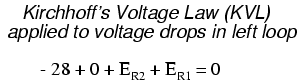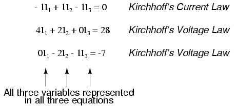 You might be wondering why we went through all the trouble of manipulating this equation from its initial form (-28 + ER2 + ER1). After all, the last two terms are still unknown, so what advantage is there to expressing them in terms of unknown voltages or as unknown currents (multiplied by resistances)? The purpose in doing this is to get the KVL equation expressed using the same unknown variables as the KCL equation, for this is a necessary requirement for any simultaneous equation solution method. To solve for three unknown currents (I1, I2, and I3), we must have three equations relating these three currents (not voltages!) together.