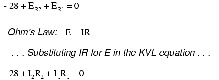 Of course, we don't yet know what the voltage is across R1 or R2, so we can't insert those values into the equation as numerical figures at this point. However, we do know that all three voltages must algebraically add to zero, so the equation is true. We can go a step further and express the unknown voltages as the product of the corresponding unknown currents (I1 and I2) and their respective resistors, following Ohm's Law (E=IR), as well as eliminate the 0 term:
