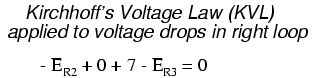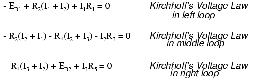 Kirchhoff's Voltage Law (KVL) tells us that the algebraic sum of all voltages in a loop must equal zero, so we can create more equations with current terms (I1, I2, and I3) for our simultaneous equations. To obtain a KVL equation, we must tally voltage drops in a loop of the circuit, as though we were measuring with a real voltmeter. I'll choose to trace the left loop of this circuit first, starting from the upper-left corner and moving counter-clockwise (the choice of starting points and directions is arbitrary). The result will look like this:
