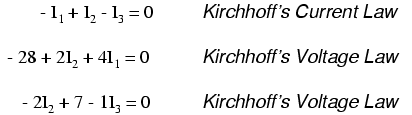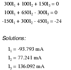 Now we have a mathematical system of three equations (one KCL equation and two KVL equations) and three unknowns: