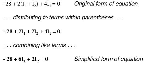 Notice that the middle term of the equation uses the sum of mesh currents I1 and I2 as the current through resistor R2. This is because mesh currents I1 and I2 are going the same direction through R2, and thus complement each other. Distributing the coefficient of 2 to the I1 and I2 terms, and then combining I1 terms in the equation, we can simplify as such: