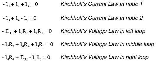 I suppose if you have nothing better to do with your time than to solve for five unknown variables with five equations, you might not mind using the Branch Current method of analysis for this circuit. For those of us who have better things to do with our time, the Mesh Current method is a whole lot easier, requiring only three unknowns and three equations to solve: