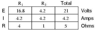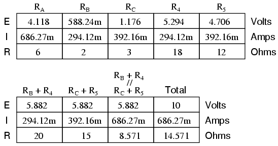 Resistors R4 and R5, of course, remain the same at 18 Ω and 12 Ω, respectively. Analyzing the circuit now as a series/parallel combination, we arrive at the following figures: