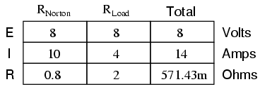 This means that both Thevenin and Norton equivalent circuits should produce the same voltage across the load terminals with no load resistor attached. With the Thevenin equivalent, the open-circuited voltage would be equal to the Thevenin source voltage (no circuit current present to drop voltage across the series resistor), which is 11.2 volts in this case. With the Norton equivalent circuit, all 14 amps from the Norton current source would have to flow through the 0.8 Ω Norton resistance, producing the exact same voltage, 11.2 volts (E=IR). Thus, we can say that the Thevenin voltage is equal to the Norton current times the Norton resistance: