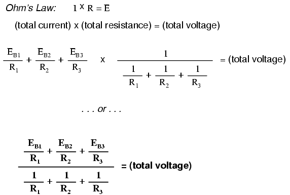 Parts of this equation seem familiar to equations we've seen before. For instance, the denominator of the large fraction looks conspicuously like the denominator of our parallel resistance equation. And, of course, the E/R terms in the numerator of the large fraction should give figures for current, Ohm's Law being what it is (I=E/R).