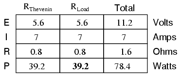Taking our Thevenin equivalent example circuit, the Maximum Power Transfer Theorem tells us that the load resistance resulting in greatest power dissipation is equal in value to the Thevenin resistance (in this case, 0.8 Ω):