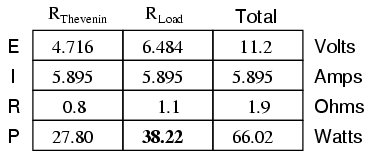 Power dissipation increased for both the Thevenin resistance and the total circuit, but it decreased for the load resistor. Likewise, if we increase the load resistance (1.1 Ω instead of 0.8 Ω, for example), power dissipation will also be less than it was at 0.8 Ω exactly: