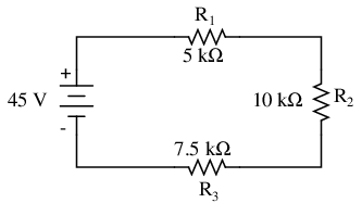 The fact that series voltages add up should be no mystery, but we notice that the polarity of these voltages makes a lot of difference in how the figures add. While reading voltage across R1, R1--R2, and R1--R2--R3 (I'm using a "double-dash" symbol "--" to represent the series connection between resistors R1, R2, and R3), we see how the voltages measure successively larger (albeit negative) magnitudes, because the polarities of the individual voltage drops are in the same orientation (positive left, negative right). The sum of the voltage drops across R1, R2, and R3 equals 45 volts, which is the same as the battery's output, except that the battery's polarity is opposite that of the resistor voltage drops (negative left, positive right), so we end up with 0 volts measured across the whole string of components.