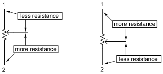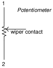 The wiper contact is the left-facing arrow symbol drawn in the middle of the vertical resistor element. As it is moved up, it contacts the resistive strip closer to terminal 1 and further away from terminal 2, lowering resistance to terminal 1 and raising resistance to terminal 2. As it is moved down, the opposite effect results. The resistance as measured between terminals 1 and 2 is constant for any wiper position.
