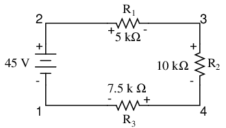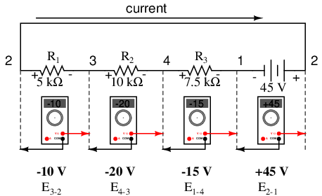 If we were to connect a voltmeter between points 2 and 1, red test lead to point 2 and black test lead to point 1, the meter would register +45 volts. Typically the "+" sign is not shown, but rather implied, for positive readings in digital meter displays. However, for this lesson the polarity of the voltage reading is very important and so I will show positive numbers explicitly: