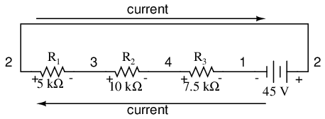 Let's take another look at our example series circuit, this time numbering the points in the circuit for voltage reference: