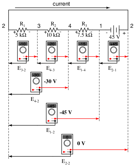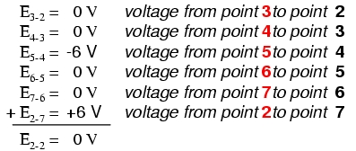 Note how I label the final (sum) voltage as E2-2. Since we began our loop-stepping sequence at point 2 and ended at point 2, the algebraic sum of those voltages will be the same as the voltage measured between the same point (E2-2), which of course must be zero.