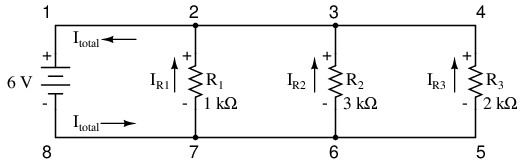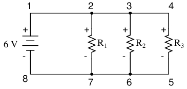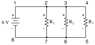 Being a parallel circuit, the voltage across every resistor is the same as the supply voltage: 6 volts. Tallying up voltages around loop 2-3-4-5-6-7-2, we get: