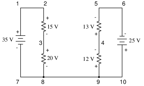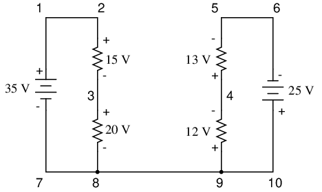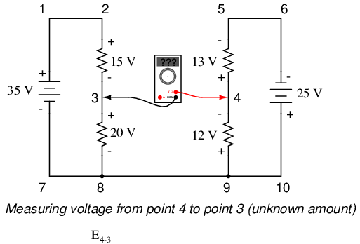 To make the problem simpler, I've omitted resistance values and simply given voltage drops across each resistor. The two series circuits share a common wire between them (wire 7-8-9-10), making voltage measurements between the two circuits possible. If we wanted to determine the voltage between points 4 and 3, we could set up a KVL equation with the voltage between those points as the unknown: