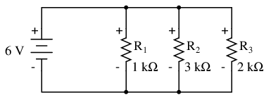 Once again, it should be apparent that the current through each resistor is related to its resistance, given that the voltage across all resistors is the same. Rather than being directly proportional, the relationship here is one of inverse proportion. For example, the current through R1 is twice as much as the current through R3, which has twice the resistance of R1.