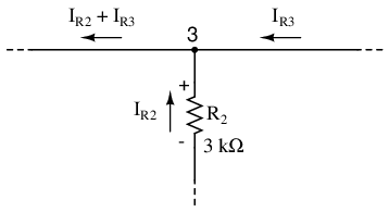 Taking our example node (number 3), we can determine the magnitude of the current exiting from the left by setting up a KCL equation with that current as the unknown value: