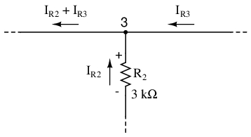 If we were to take a closer look at one particular "tee" node, such as node 3, we see that the current entering the node is equal in magnitude to the current exiting the node: