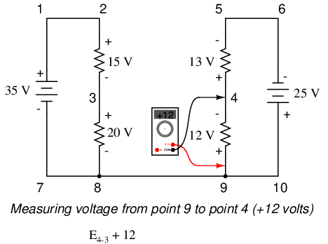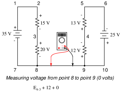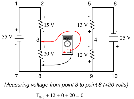 Stepping around the loop 3-4-9-8-3, we write the voltage drop figures as a digital voltmeter would register them, measuring with the red test lead on the point ahead and black test lead on the point behind as we progress around the loop. Therefore, the voltage from point 9 to point 4 is a positive (+) 12 volts because the "red lead" is on point 9 and the "black lead" is on point 4. The voltage from point 3 to point 8 is a positive (+) 20 volts because the "red lead" is on point 3 and the "black lead" is on point 8. The voltage from point 8 to point 9 is zero, of course, because those two points are electrically common.