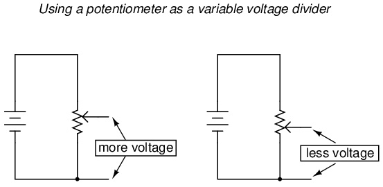When used in this manner, the name potentiometer makes perfect sense: they meter (control) the potential (voltage) applied across them by creating a variable voltage-divider ratio. This use of the three-terminal potentiometer as a variable voltage divider is very popular in circuit design.