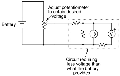 This application of the potentiometer is a very useful means of obtaining a variable voltage from a fixed-voltage source such as a battery. If a circuit you're building requires a certain amount of voltage that is less than the value of an available battery's voltage, you may connect the outer terminals of a potentiometer across that battery and "dial up" whatever voltage you need between the potentiometer wiper and one of the outer terminals for use in your circuit: