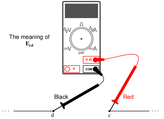 When a voltage is specified with a double subscript (the characters "2-1" in the notation "E2-1"), it means the voltage at the first point (2) as measured in reference to the second point (1). A voltage specified as "Ecd" would mean the voltage as indicated by a digital meter with the red test lead on point "c" and the black test lead on point "d": the voltage at "c" in reference to "d".