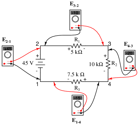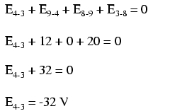 In other words, the initial placement of our "meter leads" in this KVL problem was "backwards." Had we generated our KVL equation starting with E3-4 instead of E4-3, stepping around the same loop with the opposite meter lead orientation, the final answer would have been E3-4 = +32 volts: