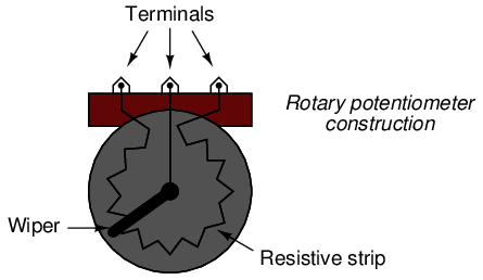 The following photograph shows a real, rotary potentiometer with exposed wiper and slidewire for easy viewing. The shaft which moves the wiper has been turned almost fully clockwise so that the wiper is nearly touching the left terminal end of the slidewire: