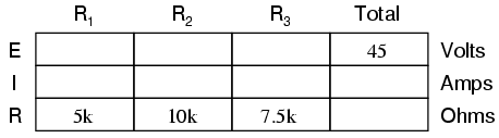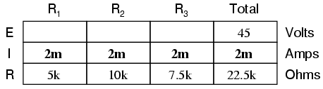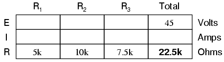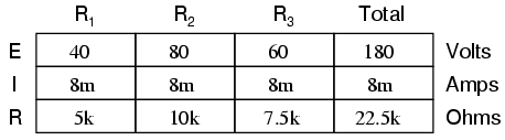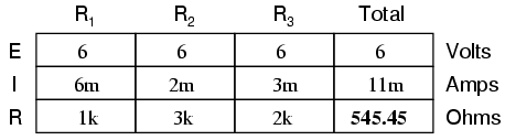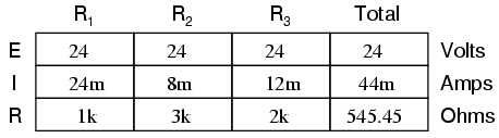 The final step, of course, is to figure total resistance. This can be done with Ohm's Law (R=E/I) in the "total" column, or with the parallel resistance formula from individual resistances. Either way, we'll get the same answer:
