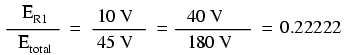 With a little more observation, it becomes apparent that the voltage drop across each resistor is also a fixed proportion of the supply voltage. The voltage across R1, for example, was 10 volts when the battery supply was 45 volts. When the battery voltage was increased to 180 volts (4 times as much), the voltage drop across R1 also increased by a factor of 4 (from 10 to 40 volts). The ratio between R1's voltage drop and total voltage, however, did not change: