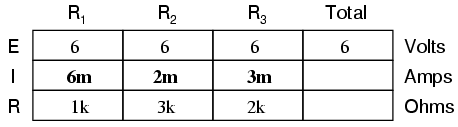 Knowing that voltages across all components in a parallel circuit are the same, we can fill in our voltage/current/resistance table with 6 volts across the top row: