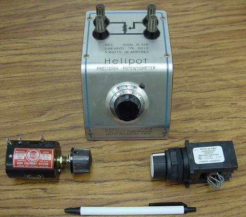 The large "Helipot" unit is a laboratory potentiometer designed for quick and easy connection to a circuit. The unit in the lower-left corner of the photograph is the same type of potentiometer, just without a case or 10-turn counting dial. Both of these potentiometers are precision units, using multi-turn helical-track resistance strips and wiper mechanisms for making small adjustments. The unit on the lower-right is a panel-mount potentiometer, designed for rough service in industrial applications.