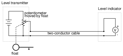 The internal workings of the transmitter's current source need not be a concern at this point, only the fact that its output varies in response to changes in the float position, just like the potentiometer setup in the voltage signal system varied voltage output according to float position.