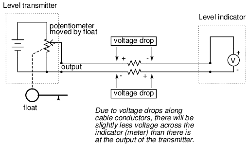 This elementary transmitter/indicator system is reliable and easy to understand, but it has its limitations. Perhaps greatest is the fact that the system accuracy can be influenced by excessive cable resistance. Remember that real voltmeters draw small amounts of current, even though it is ideal for a voltmeter not to draw any current at all. This being the case, especially for the kind of heavy, rugged analog meter movement likely used for an industrial-quality system, there will be a small amount of current through the 2-conductor cable wires. The cable, having a small amount of resistance along its length, will consequently drop a small amount of voltage, leaving less voltage across the indicator's leads than what is across the leads of the transmitter. This loss of voltage, however small, constitutes an error in measurement: