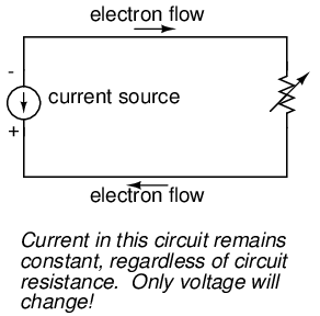 A current source generates as much or as little voltage as needed across its leads to produce a constant amount of current through it. This is just the opposite of a voltage source (an ideal battery), which will output as much or as little current as demanded by the external circuit in maintaining its output voltage constant. Following the "conventional flow" symbology typical of electronic devices, the arrow points against the direction of electron motion. Apologies for this confusing notation: another legacy of Benjamin Franklin's false assumption of electron flow!