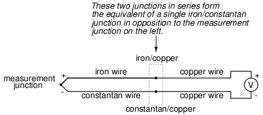 The second iron/copper junction formed by the connection between the thermocouple and the meter on the top wire will produce a temperature-dependent voltage opposed in polarity to the voltage produced at the measurement junction. This means that the voltage between the voltmeter's copper leads will be a function of the difference in temperature between the two junctions, and not the temperature at the measurement junction alone. Even for thermocouple types where copper is not one of the dissimilar metals, the combination of the two metals joining the copper leads of the measuring instrument forms a junction equivalent to the measurement junction: