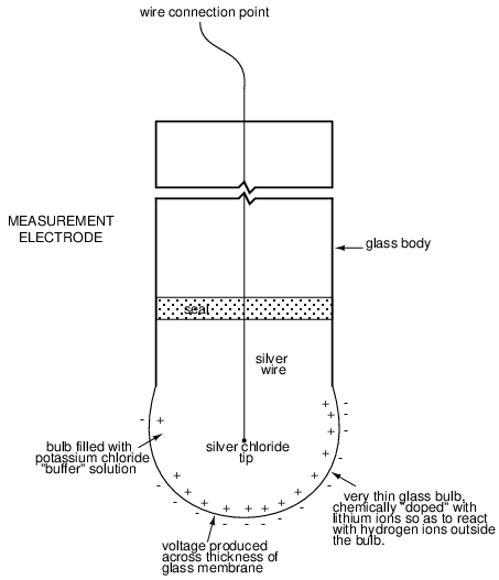One electrode, made of a special glass, is called the measurement electrode. It's job it to generate a small voltage proportional to pH (ideally 59.16 mV per pH unit).