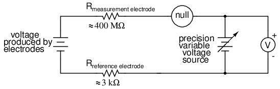As usual, the precision voltage supply would be adjusted by the technician until the null detector registered zero, then the voltmeter connected in parallel with the supply would be viewed to obtain a voltage reading. With the detector "nulled" (registering exactly zero), there should be zero current in the pH electrode circuit, and therefore no voltage dropped across the resistances of either electrode, giving the real electrode voltage at the voltmeter terminals.