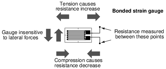 A strain gauge's conductors are very thin: if made of round wire, about 1/1000 inch in diameter. Alternatively, strain gauge conductors may be thin strips of metallic film deposited on a nonconducting substrate material called the carrier. The latter form of strain gauge is represented in the previous illustration. The name "bonded gauge" is given to strain gauges that are glued to a larger structure under stress (called the test specimen). The task of bonding strain gauges to test specimens may appear to be very simple, but it is not. "Gauging" is a craft in its own right, absolutely essential for obtaining accurate, stable strain measurements. It is also possible to use an unmounted gauge wire stretched between two mechanical points to measure tension, but this technique has its limitations.