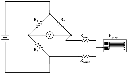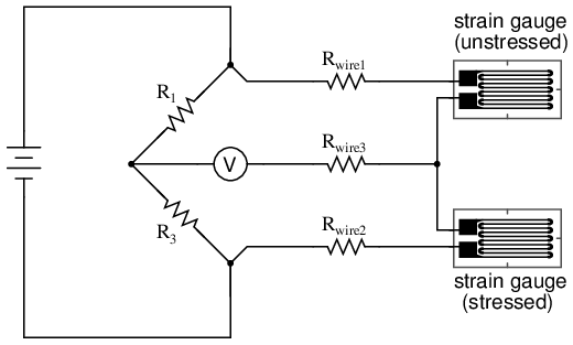 While this effect cannot be completely eliminated in this configuration, it can be minimized with the addition of a third wire, connecting the right side of the voltmeter directly to the upper wire of the strain gauge: