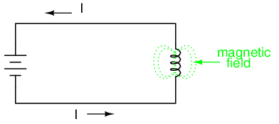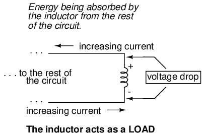 When the current through an inductor is increased, it drops a voltage opposing the direction of electron flow, acting as a power load. In this condition the inductor is said to be charging, because there is an increasing amount of energy being stored in its magnetic field. Note the polarity of the voltage with regard to the direction of current: