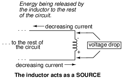 Conversely, when the current through the inductor is decreased, it drops a voltage aiding the direction of electron flow, acting as a power source. In this condition the inductor is said to be discharging, because its store of energy is decreasing as it releases energy from its magnetic field to the rest of the circuit. Note the polarity of the voltage with regard to the direction of current.