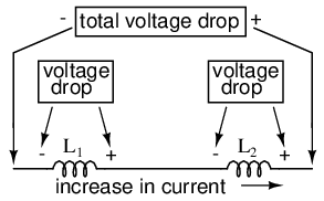 When inductors are connected in series, the total inductance is the sum of the individual inductors' inductances. To understand why this is so, consider the following: the definitive measure of inductance is the amount of voltage dropped across an inductor for a given rate of current change through it. If inductors are connected together in series (thus sharing the same current, and seeing the same rate of change in current), then the total voltage dropped as the result of a change in current will be additive with each inductor, creating a greater total voltage than either of the individual inductors alone. Greater voltage for the same rate of change in current means greater inductance.