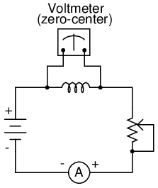 Suppose we were to connect a perfect inductor (one having zero ohms of wire resistance) to a circuit where we could vary the amount of current through it with a potentiometer connected as a variable resistor: