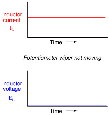 If the potentiometer mechanism remains in a single position (wiper is stationary), the series-connected ammeter will register a constant (unchanging) current, and the voltmeter connected across the inductor will register 0 volts. In this scenario, the instantaneous rate of current change (di/dt) is equal to zero, because the current is stable. The equation tells us that with 0 amps per second change for a di/dt, there must be zero instantaneous voltage (v) across the inductor. From a physical perspective, with no current change, there will be a steady magnetic field generated by the inductor. With no change in magnetic flux (dΦ/dt = 0 Webers per second), there will be no voltage dropped across the length of the coil due to induction.
