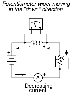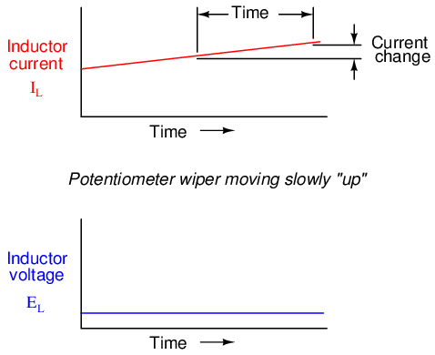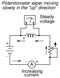 Assuming that the potentiometer wiper is being moved such that the rate of current increase through the inductor is steady, the di/dt term of the formula will be a fixed value. This fixed value, multiplied by the inductor's inductance in Henrys (also fixed), results in a fixed voltage of some magnitude. From a physical perspective, the gradual increase in current results in a magnetic field that is likewise increasing. This gradual increase in magnetic flux causes a voltage to be induced in the coil as expressed by Michael Faraday's induction equation e = N(dΦ/dt). This self-induced voltage across the coil, as a result of a gradual change in current magnitude through the coil, happens to be of a polarity that attempts to oppose the change in current. In other words, the induced voltage polarity resulting from an increase in current will be oriented in such a way as to push against the direction of current, to try to keep the current at its former magnitude. This phenomenon exhibits a more general principle of physics known as Lenz's Law, which states that an induced effect will always be opposed to the cause producing it.