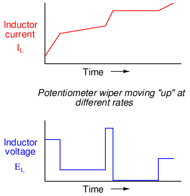 Changing the rate of current increase through the inductor by moving the potentiometer wiper "up" at different speeds results in different amounts of voltage being dropped across the inductor, all with the same polarity (opposing the increase in current):